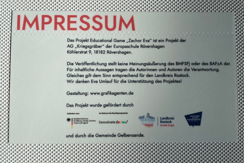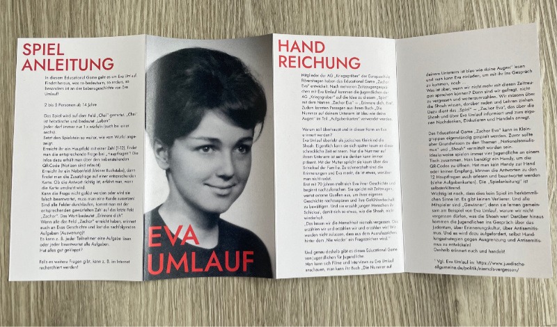 Nach mehreren Zeitzeugengesprächen mit Eva Umlauf kommen die Jugendlichen der AG „Kriegsgräber“ auf die Idee zu diesem „Spiel“ mit dem Namen „Zachor Eva“ – „Erinnere dich, Eva“ .