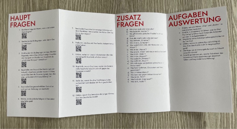 Dann gibt es Nebenfelder mit kleinen Buchstaben (a-t). Hier werden Zusatzfragen auf einer entsprechenden Karte gestellt. Die jeweilige Antwort ist auf der Rückseite jeder Karte vermerkt.Sind alle Felder durchlaufen, kommt man auf das letzte Feld „Zachor“. Das Wort bedeutet „Erinnere dich“. Wenn alle das Feld „Zachor“ erreicht haben, soll gemeinsam an Evas Geschichte erinnert werden (Auswertung). Dazu werden zusammenfassende Aufgaben gestellt, die z. B. in einem gemeinsamen Gruppengespräch gelöst werden müssen.